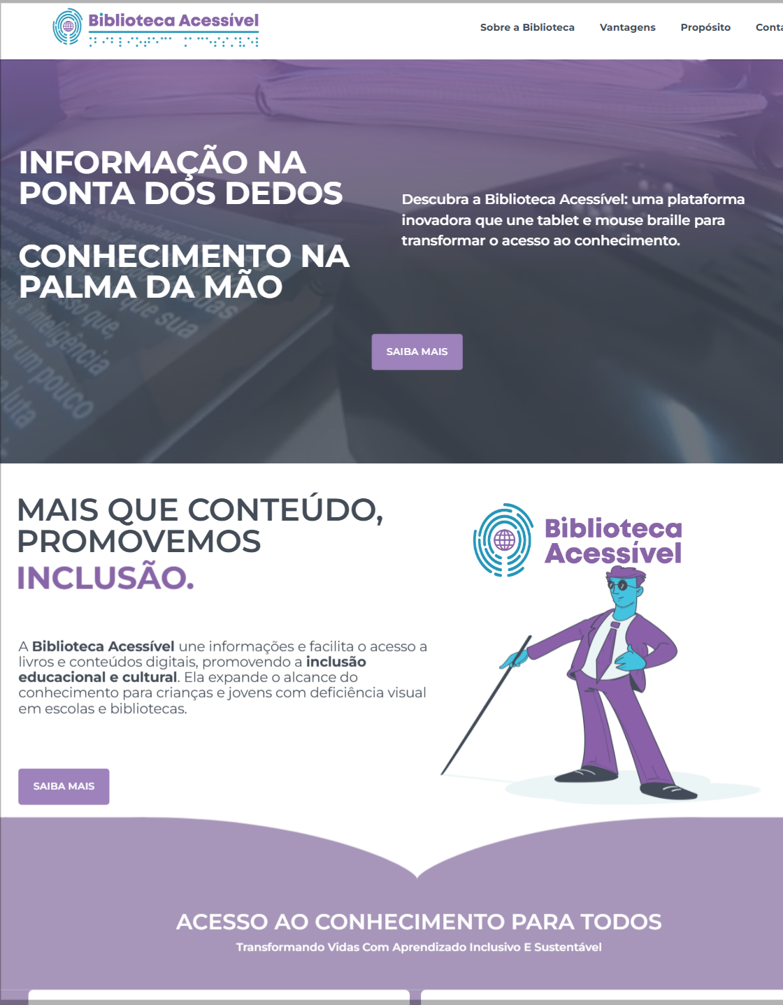 Para a AED Tecnologia, criamos o site da Biblioteca acessível. Como proposta, desenvolvemos um site claro e direto com ferramentas de acessibilidade associadas, que mostrasse a solução que é a Biblioteca Acessível: uma plataforma inovadora, que une um mouse braille e um tablet.